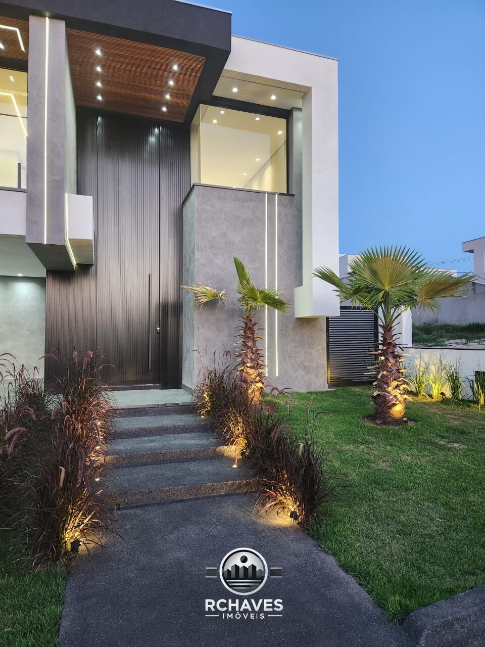 - Porta de entrada imponente em alumínio com 5,80 metros, oferecendo uma recepção marcante.